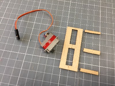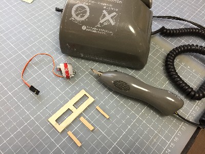 サーボベッドは1.5mmの航空ベニアから切り出します。経験的に1mmでは強度不足、2mmでは過剰です。 超音波カッターがあるととても便利ですね。カッターのみで手切りしても良いですが、結構たいへんです。 最近は翼内サーボ仕様の期待が多いので2サーボ仕様です。 ビス部分は1.5mmの航空ベニアでは厚み不足ですのでビスの部分のみ補強を入れます。