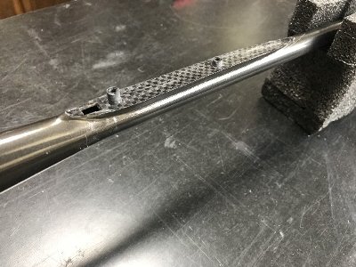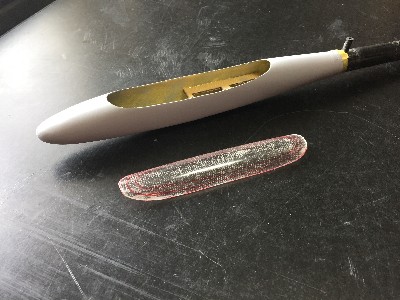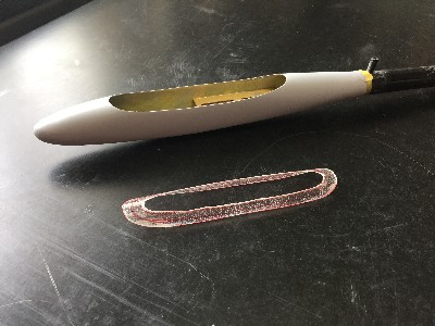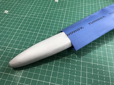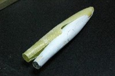 予め型をとっておいたシュリンクチューブを巻きつけます。 写真の白い筋は反射光で光っているのではなく、最終的にどうしてもできてしまう「口開き」の写真をとったものです。 シュリンクチューブを用いても、ノーズの先端部分まではカバーすることはできません。 |