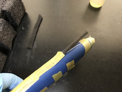 「口開き」の部分は圧力不足でクロスが浮いてしまうので、浮き上がりを抑えるために薄い離型素材:たとえばクリアファイルや厚手のポリエチレン袋を短冊状にカットしたものをを予め挟み込んでおいて写真のように上からスポンジで押さえます。 |
