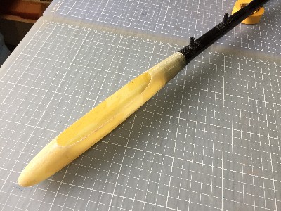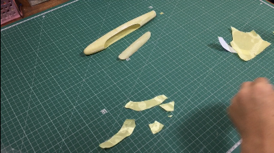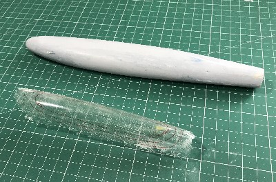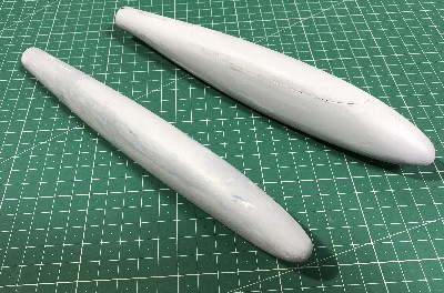 雄型はバルサから削り出します。勿論、硬い木材から削り出した方が傷もつきにくいのですが削り出しが大変なのでバルサを使用。 削り出した後はサーフェサー#500で表面を平滑にします。 写真の雄型は相当数のポッドを制作しましたので少々くたびれてきています。 右は4サーボ用、右は2サーボ用 |