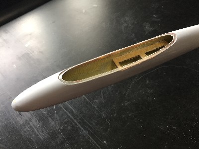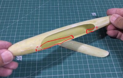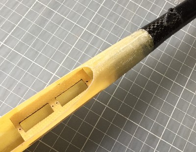 アラミドクロス1.7ozのパッチで内側から補強します。 開口部の四隅に貼ります。経験的に開口部の四隅に応力集中して壊れやすいです。 パッチは写真の赤枠の部分(反対側も) PODは後でつけるサーボベッドで強度を確保します。サーボベッドが欠損する部分も補強します。(サーボベッドの位置は跡ででてくる写真を参照ください)