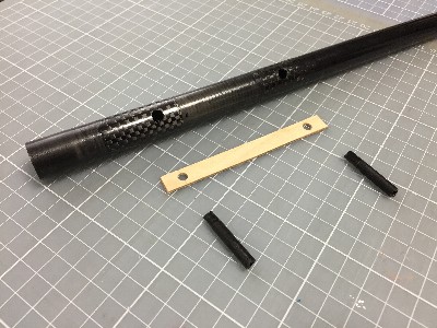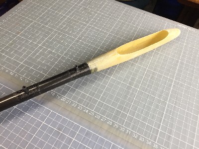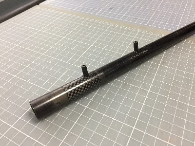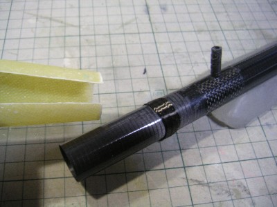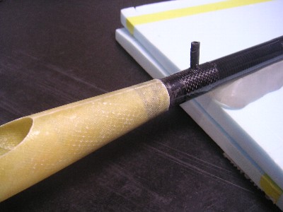 次にPODを15分エポキシ接着剤で接着します。 接着しろを確保する為に、カーボンロービングをルーズに巻きつけます。 |