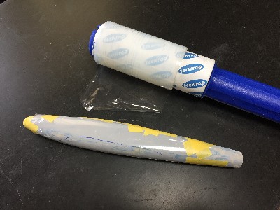 ハッチをつける為の内枠を制作します。 本来は内枠専用の型をつくればよいのですがPODの雄型で兼用します。 最初に離型用のストレッチフィルムをPOD雄型シワを作らないように伸ばしながら注意深く貼り付けます。 |