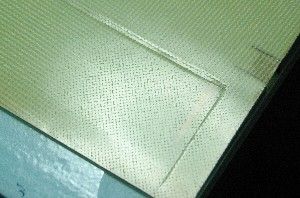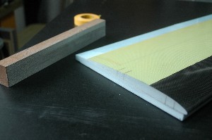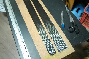カーボンクロスの切り出し。中央側60ミリ、翼端側40ミリ、長さ820ミリ。 アラミドとの境界側は繊維に平行に、ほつれがないように慎重にカットします。 このあと、カーボンクロス全面にスプレーのりを塗った後、放置して乾かしておきます。(77を使っていますが、粘着が強すぎますので、55の方が良いかもしれません) |