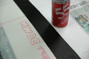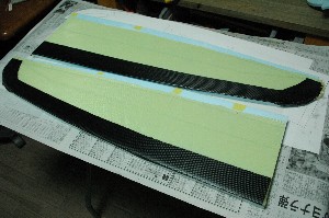 カーボンクロスをマイラーシートのガイドラインに沿って載せていきます。予めスプレーのリを吹き付けていますので、載せるというよりは、貼りつける感じの作業となります。 |