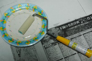 樹脂の塗布には塗装ローラー(スモールローラー、毛丈4ミリor5ミリタイプ)を使ってみたところ、樹脂のふくみが均一にでき、とてもグッドでした。値段が高いのが難点です・・・ 巾は4インチあるのですが、端から2.5センチほどカッターで切り落としました。 |