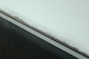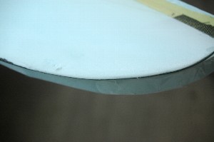 バッグから取り出したあと、前縁部のトリミングを行います。 カッターで余分をそぎ落とした後、ペーパーで境界部の段差をなくします。(コアまで削ってしまわないように細心の注意を払います) |