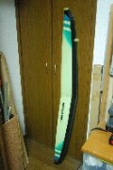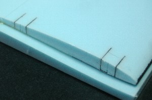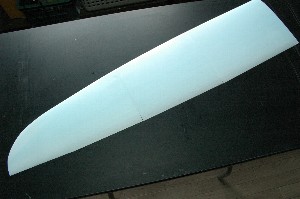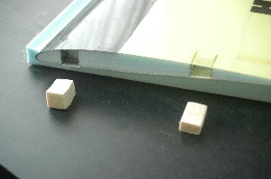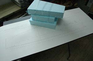 主翼の接合は、ネガティブコアでベッドを作って行います。上半角は90ミリ。 接合部に30分エポキシ接着剤を塗布→接着剤を塗ったハードポイントを挿入→主翼接合→主翼裏面から左右の翼をセロテープ止めて口が開かないようにする→ベッドに載せる→接合部にスポンジをおいて重しを載せる。 という手順です。接合部の口が開かないように主翼裏面から左右の翼をセロテープ止めするのがポイントです。 2010.6加筆) ベッドはしっかりとした板(集成材など)を使用した方が正確に接合できます。 |