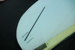 今回のテーマのひとつである剛性UPの為にペグ側の翼端に外径1.5ミリ内径0.7ミリのカーボンパイプを埋め込みます。 写真にはありませんが1.4ミリのカーボンロッドをさらにもう1本加えました。 |
