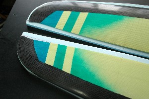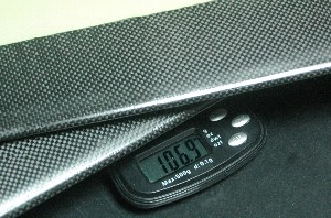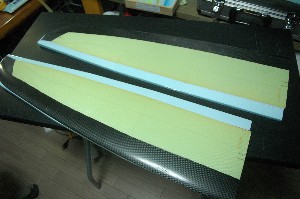 主翼重量は約107gとなりました。目標達成・・・と言いたいところですが、カーボン表面の樹脂が不足気味なのが残念。(強度的には前作以上にしっかりしています。前作では軽量化の為にアラミドとカーボンの重なりを少なくしましたが、今回は裏表共アラミドは前縁近くまで入っているのが寄与していると思われます) 今回はエルロンをクランクで動かそうとしているので2-3gの重量増を見込むと110g程度で仕上がると思います。 |