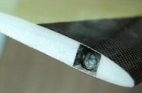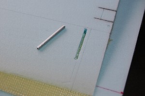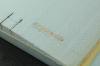 主翼接続部に、ハードポイント(かんざし)を取り付けるための仕込みをしておきます。(カーボンシートを差込み。接着剤はあとで削り出す部分には付けないでおきます。さらに直交方向のカットも入れておきます) 前作でうまくいきましたので、今回も採用。 2010.6加筆) カーボンシートの差込みは”過剰”なようです。カッターの切れ目だけでも後工程が楽になります。 |