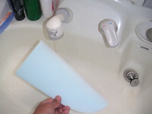 翼端側のコア整形が完了したら、表面に残っている削りカスをシャワーで洗い落とします。(直貼りの接着度を上げるためです) ※スタイロフォームの気泡は「独立気泡」なので、水が奥のほうまで染込んでいくことはありません |