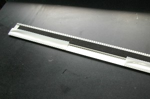 エルロンカットは加工しやすいので主翼接合前に行います。 カット定規の裏にビニールテープを貼っておくと、定規が滑らないので加工が楽です。 |