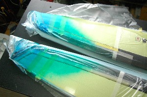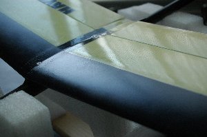 Dボックスのカーボン部分の樹脂が不足していたので主翼完成後に和紙貼り(再バギング)の後、塗装仕上げにしました。織り目が完全に消えてツルツルになりました。(カーボン部分のみ) 最終的にWAXもかけましたので手で触ってもフワフワです。 ※完成した主翼を再バギング、アラミドとの境目部分の段差消し、塗装、研磨と大変でした A=´、`=)ゞ |