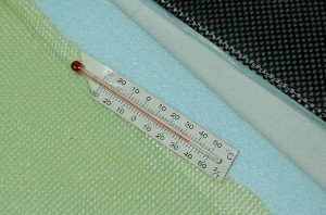 これ、夜9時の室温です(36度)。昼間は40度くらいになっているでしょう。 樹脂の硬化には最適ですが、作業時間が短く、作業をあせってしまいますので夏場のバギングは良いのだか悪いのだか・・ |