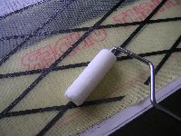 この上に、準備したカーボンを載せます。交差部分は意外と樹脂がしみこみ難いので一方方向づつ配置します。 |