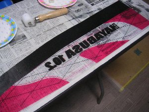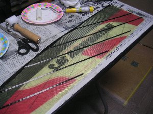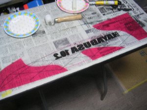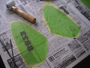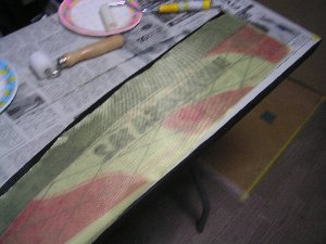 デザイン和紙のセット。このあと和紙の上から樹脂を塗って十分に染みこませます。 ※和紙は樹脂先塗りの方がきれいに仕上がるので全面和紙貼りの場合は従来から先に樹脂を塗っていました。 |