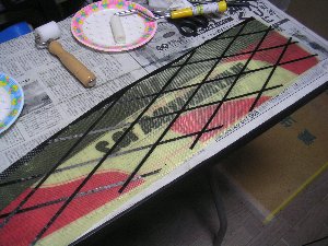 今回は網タイツ仕様。 バックプレートに網柄をマジックで書き込みます。 ※和紙貼りデザイン部分も位置決めのラインを入れてあります。 和紙全面貼りを止めることに替えて、ピンホールをなくす為にバックプレートにクリアスプレーを吹き付けておきました。(転写法) |