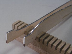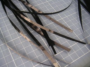 レーザーカットとは言え、元データが座標をプロットした多角形なのでカットも多角形の名残りが残っています。注意深くサンドペーパーでならします。 切断面に瞬間接着剤を流して固めた後、電熱線が走り易いように接触面を微妙にラウンドに整形してから、キッチン用アルミテープを巾1.5ミリにカットしたものを貼り付けて準備完了。 |