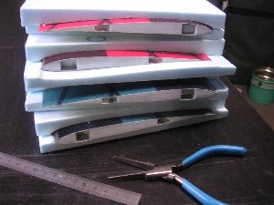ハードポイントの加工。 管理人の場合、バギング前に予めコアに掘り込みラインにカッターを入れています。写真のペンチ、先が平たくなっていて、うまい具合にコアをつまんで取り出すことが出来ます。ものの数分ででき上がります。このペンチ、どこでどうやって手に入れたか思い出せません・・ 名前も分かりません。 この記事を書きながら思い出したのは、トランジスタなどの半導体を半田付けする際に熱を逃がす役割をもったペンチだったような・・・・ |
