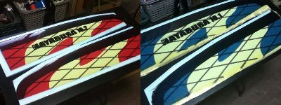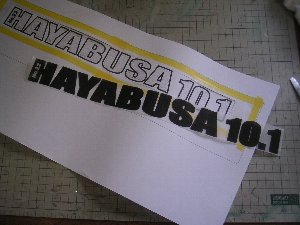 HAYABUSAのネームは無地の和紙(江崎プライスパン)にプリンターでプリント。和紙は台紙に貼り付けます。台紙はA3のコピー用紙から210x400のサイズに切り出しています。 プリンターはA4までしか使えないのですが、紙のサイズに”ユーザー定義サイズ”を選択することで任意サイズに設定できますのでこの機能を用いて210x400に設定します。(CANONプリンタ)