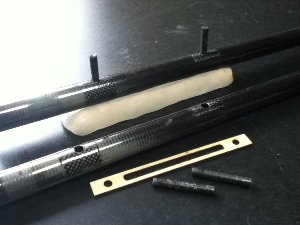 hayabusaで採用している主翼パイロン方式。少しづつ改良していますが、この方式でかなりの実績を積んできました。 ・パイロン穴部分は応力集中が懸念されるので25ミリ巾カーボンクロスで補強。 |