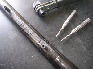 パイロンにタップを切ります。 パイロンのカーボンパイプは外径5ミリ、内径3ミリのものを使用しています。このパイプ、下穴加工をせずにそのままタップを切ってちょうどよいサイズです。 このカーボンパイプ、今は手に入りません・・ |