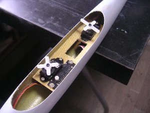 サーボベッドを取り付けます。 ポッドはギリギリの大きさなので、サーボベッドにサーボを仮留めた上で位置を決めます。 |
