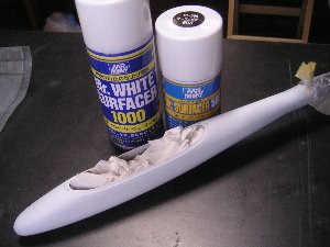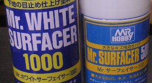 凹凸がとれたらミスターホビーのサーフェイサー500(写真右)を吹き付けます。 サーフェイサーを用いれば細かい凹凸は消えます。あと、凹凸がとれていない部分も分かり易くなるので、再度アクリルパテで調整します。 最後にサーフェイサー1000で仕上げます。(写真上) |