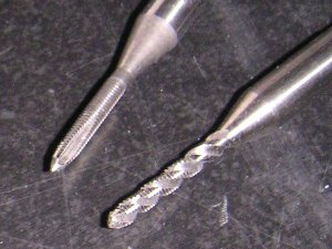 カーボンにタップを切る際、切りカスがたまり易いのですが、スパイラルタップだと、切りカスが逃げやすいので良い感じでタップが切れます。 写真右:スパイラルタップ 写真左:一般的なタップ |