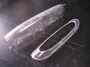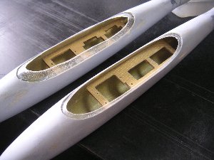 ラフカット状態の内枠を瞬間接着剤で貼り付けます。(写真奥) 説明が前後しますが、先にポッド全体の表面調整をしておきます。アクリルパテ(チューブ入)を塗って#180〜240のサンドペーパーで大まかに削ってから#320〜400のペーパーで仕上げます。 いきなり細かい番手で仕上げようとするとかえって滑らかになりません。 |