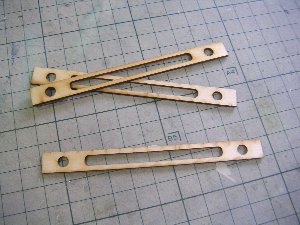 このパーツは主翼パイロンのベース。 主翼コアカット用のテンプレートをレーザーカットでオーダーメイドした際に余った部分で製作しておきました。 t1.5mmX10mmX100mmの航空ベニアに@80mmでφ5mmの穴を空けてあります。中央部は軽量化の為に肉抜きしています。(この肉抜きは重量的には僅かなのであまり意味が無いかも知れません) |