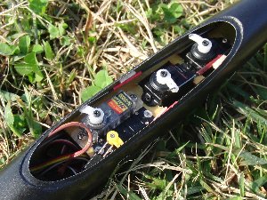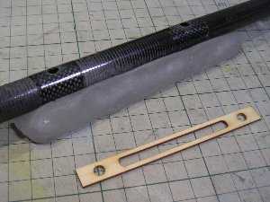 今回、パイプはクレールさんのStrong03(フル補強版)を使用。ノーマル品と比べるとかなりしっかりしています。重量は18.5g程度ありました。 パイロンが立つ部分は98gカーボン(巾25mm)で補強しています。特に後ろのパイロン部分はエルロンリンケージを取り出す長穴も明きますので弱点になります。(以前に後ろのパイロン穴部分でパイプが折れたことがあります) |