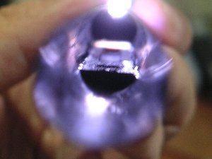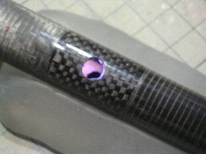 ピンボケですが、パイプの中にパイロンベースを固定した写真です。 ベース材の1.5mm航空ベニアのパイプと接する部分はテーパーをとってパイプ内面に沿うようにしておきます。 |
