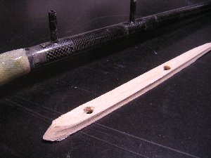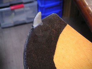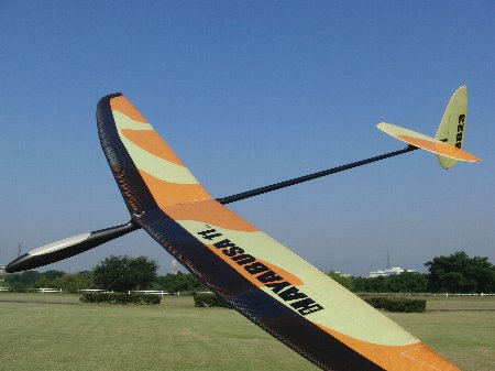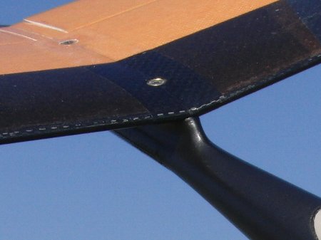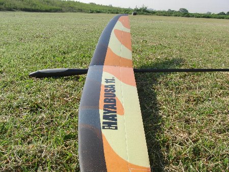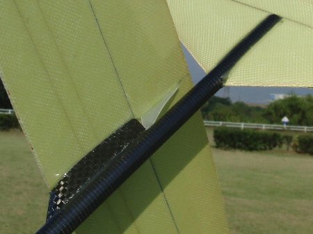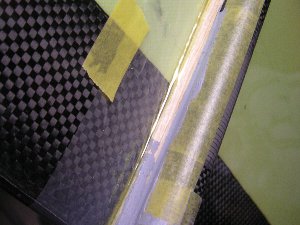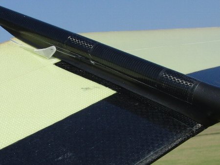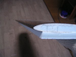 翼端へ取り付け後、内側に1ミリもしくは1.5ミリバルサを貼って整形します。 強度的には不要ですが、カーボンだけだと痛いので・・・ただ、空気抵抗が増すのが少々嫌な感じです。 |
