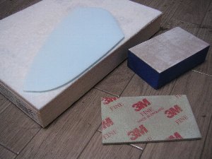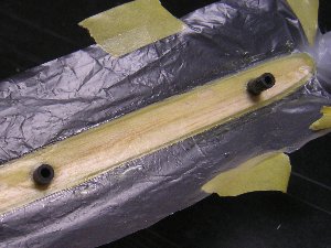 トリミングした後、前縁を鏡面仕上げにする為に再バギングします。 前縁をキレイに仕上げた後、写真のようにネガコア(前縁部15ミリカット)に載せてバギング。 |