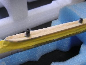 サーボベッドにはアラミドを貼って補強します。1.5ミリの航空ベニアなので、ビス部に補強する必要がなく楽チン。 ただ、肉抜きしすぎたようで、エルロンサーボのラップ部は少し柔な感じ。もう少し強度があった方が良いと感じました。 |