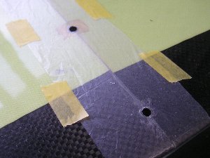主翼裏面にポリエチゴミ袋を貼ります。パイロン穴は鋭角カッターでキレイに繰り抜いておきます。 主翼裏面はマイナスRなのでポリエチゴミ袋には軽くスプレー55のりを薄っすらと吹き付けておくと良いです。 |