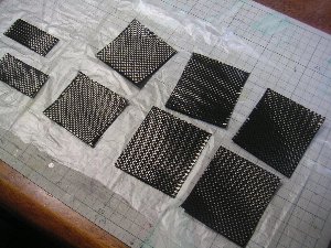 段違い翼端ペグの製作。翼端ペグはアラミドを混ぜず、カーボンクロスのみでカチカチに固めるこのポイントです。手で簡単には曲がらない位の強度が必要です。 今回はホビキンの160g/uのカーボンクロスを使用。 それぞれのクロスはスプレー55のりで2枚貼り合せておくことでほつれません。 |