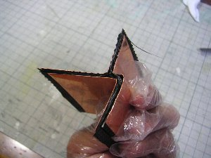 型板は本当は0.5ミリ程度のアルミ板がよいのですが、手元になかったので0.3ミリの真鍮板を使用。 0.3ミリだとかなり柔なので折り曲げ加工は容易でしたが、樹脂塗り後の養生の際は3ミリのアクリル板をかませててクランプで圧締しました。 |
