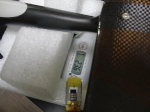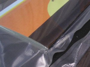 フードセーバーで再バギング。 上面はピカピカに仕上がりましたが、裏面に少々樹脂が回り込んで筋と凹凸ができてしまいました。樹脂の加減が難しいです。 尚、今回、試してみましたが樹脂を塗るだけではピンホールは潰れませんでした。hayabusa9.5で掲載しましたようにクラフトるうむさんの60gカーボンクロスを解いたものを使用する必要があります。 |