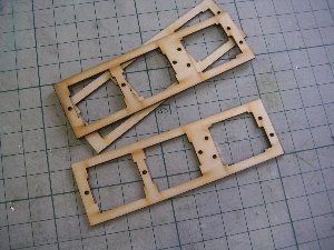 サーボベッドもレーザーカット品。 主翼コアカット用のテンプレートをレーザーカットでオーダーメイドした際に余った部分で製作しておきました。 1.5ミリの航空ベニアを用いたので軽量化の為に、これでもか!という位の肉抜き。 |
