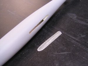 テンプレート完成。 写真の様に文字入れも可能。黒い点はコア固定用マチ針の穴、その下のラインは前縁ライン。ラインのつもりが指示不足で貫通仕上げになってしまいました。 この後、熱線の走行面に軽くペーパーをかけてからキッチンアルミテープを貼ります。 |