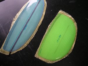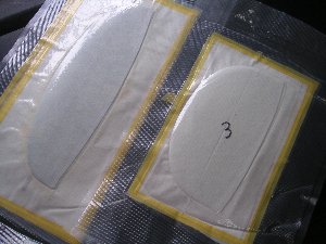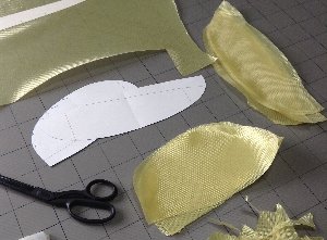 型紙を使ってアラミドの切り出し。アラミドはバイアスで使用しています。 |