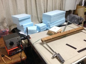 カット風景。 3セット作りました。 電源はスライダックトランス+カーバッテリー充電器の組合せ。熱線は0.4mmインコネル線。 以前よりは少なくなりましたがやはり何枚かは失敗します。 |