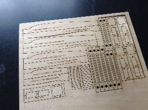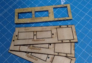 サーボベッドは主翼コアテンプレートと共にレーザーカットしました。 ラクチンです。 補強の為に表面にはアラミドを瞬間接着剤で貼り付けています。 |