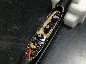 JRの送信機XG8はその機能性でハンドランチには最適なのですが、 受信機RG411BLとの組合せでは過去に何度もノーコンに見舞われました。 苦肉の策でアンテナの取出し口を設けています。 |