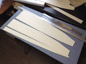 型紙の準備。 翼平面、カーボン型紙、エルロン型紙の3種類を作ります。 |
