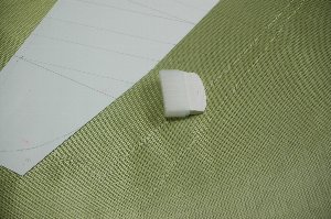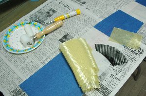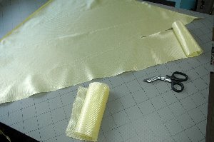 続いてアラミドの準備。アラミドは 1.0oz(35g/m2)。 今回は、アラミドなるべくキレイにカットする必要があるので、家内の裁縫箱から、布に印を付けるチョークのよーなクレヨンのよーなのを拝借して使用したところ、うまくラインを入れる事ができました。(”チャコ”と呼ぶそうです) アラミドの織り目に平行に使うと、織り目が乱れて大変なことになります。織り目に対してバイアス方向にのみ使えます。 |