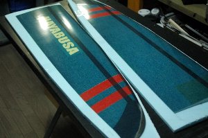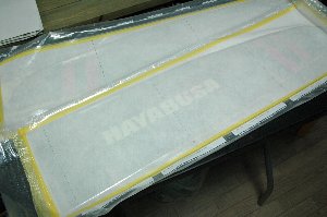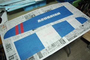 バックプレート(マイラーシート)にブルーワックスを塗った後、スプレー55を軽く吹いて、デザインに従って翼紙を配置します。今回は、青、赤、白(仕上がると透明)の3色を使いました。翼紙は貼り付けた後、バックプレート(マイラーシート)沿ってカットします。 2010.6加筆)スプレーのりを用いると光沢がなくなります。 白抜きネーム入れの方法) |